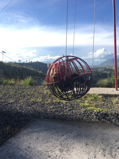 Nous marchons le long du mirador et tombons sur un petit parc d’activités. Nous sommes seuls ici. Les garçons décident de tenter « la boule », cage sous forme de balançoire qui tourne autour d’elle-même, à moitié au-dessus du vide.